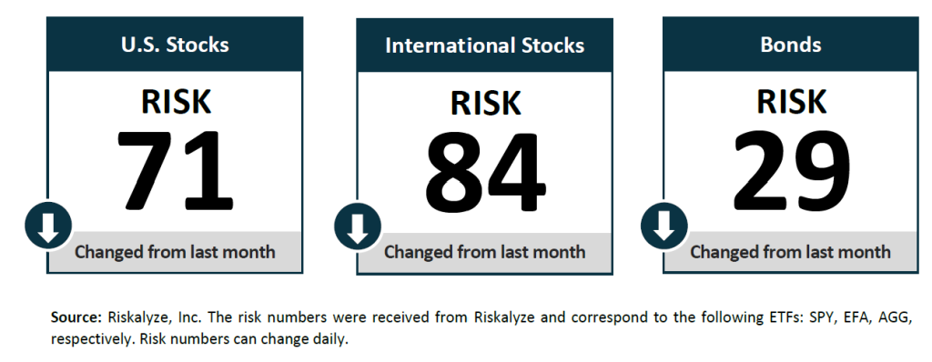 The Risk Number is at the heart of a sophisticated set of tools to precisely measure the appetite and capacity for risk that each client has and demonstrate their alignment with the portfolios built for them. The following graphic shows the risk of various asset classes as measured on a scale of 1-99 (1 being the most conservative and 99 being the most aggressive) as of the date above.