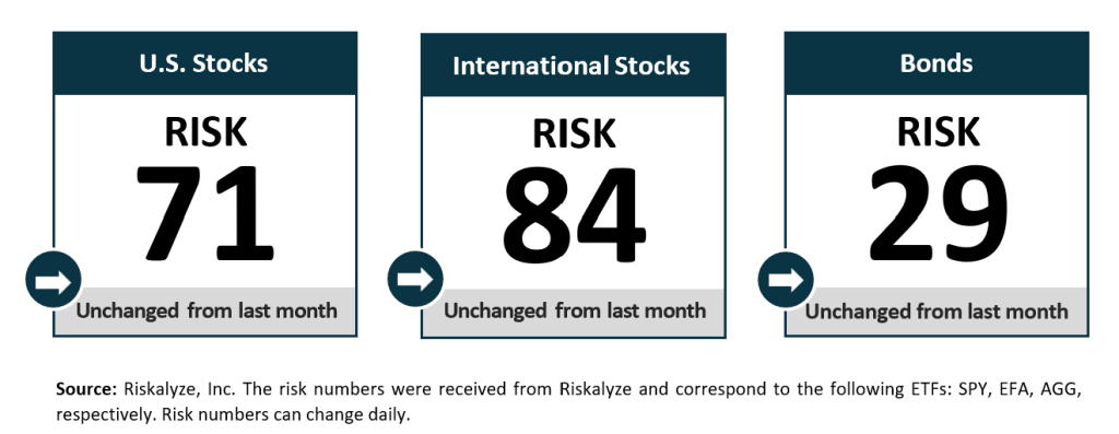 The Risk Number is at the heart of a sophisticated set of tools to precisely measure the appetite and capacity for risk that each client has and demonstrate their alignment with the portfolios built for them. The following graphic shows the risk of various asset classes as measured on a scale of 1-99 (1 being the most conservative and 99 being the most aggressive) as of the date above.